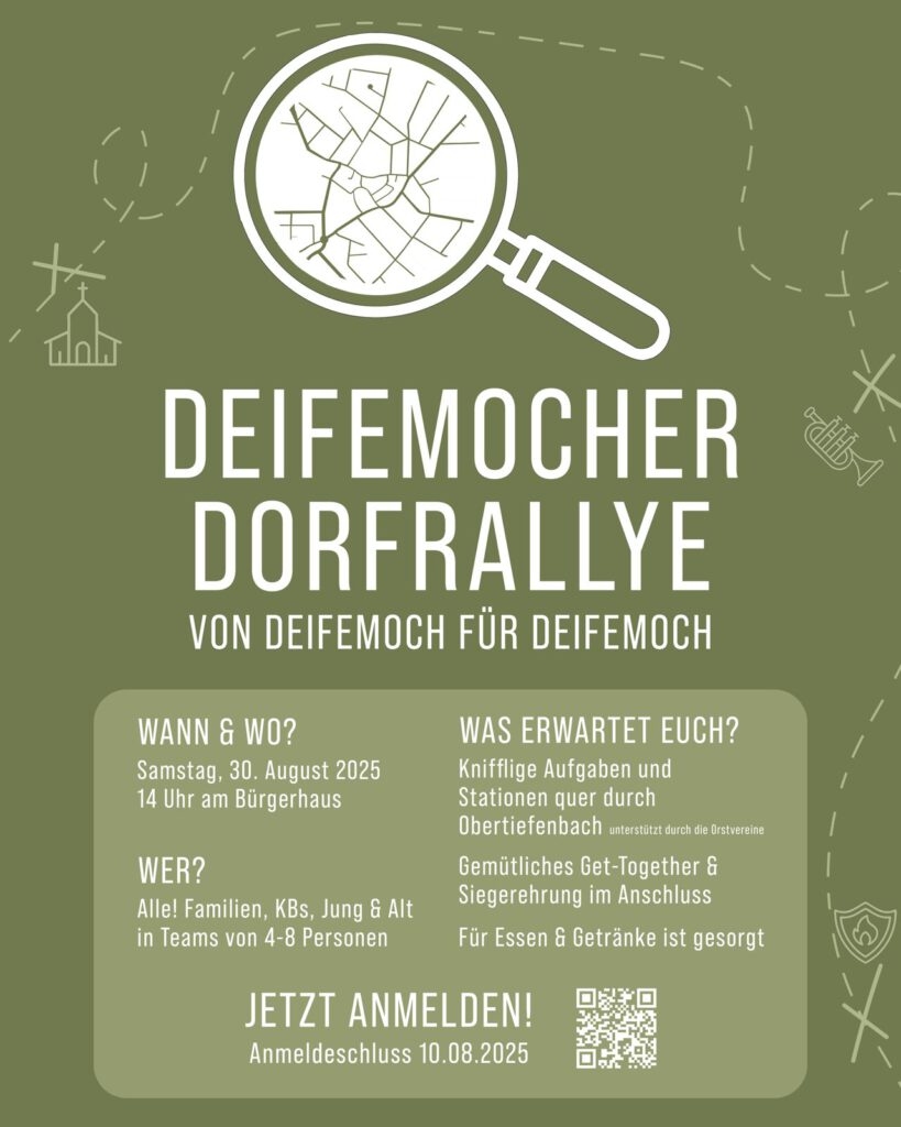 - Deifemocher DorfrallyeAm 30. August 2025 veranstaltete der Deifemocher e.V. die nächste große Aktion: die Deifemocher Dorfrallye.Schon im Vorfeld war die Spannung groß und tatsächlich wurde die Rallye zu einem vollen Erfolg.… Deifemocher Dorfrallye weiterlesen