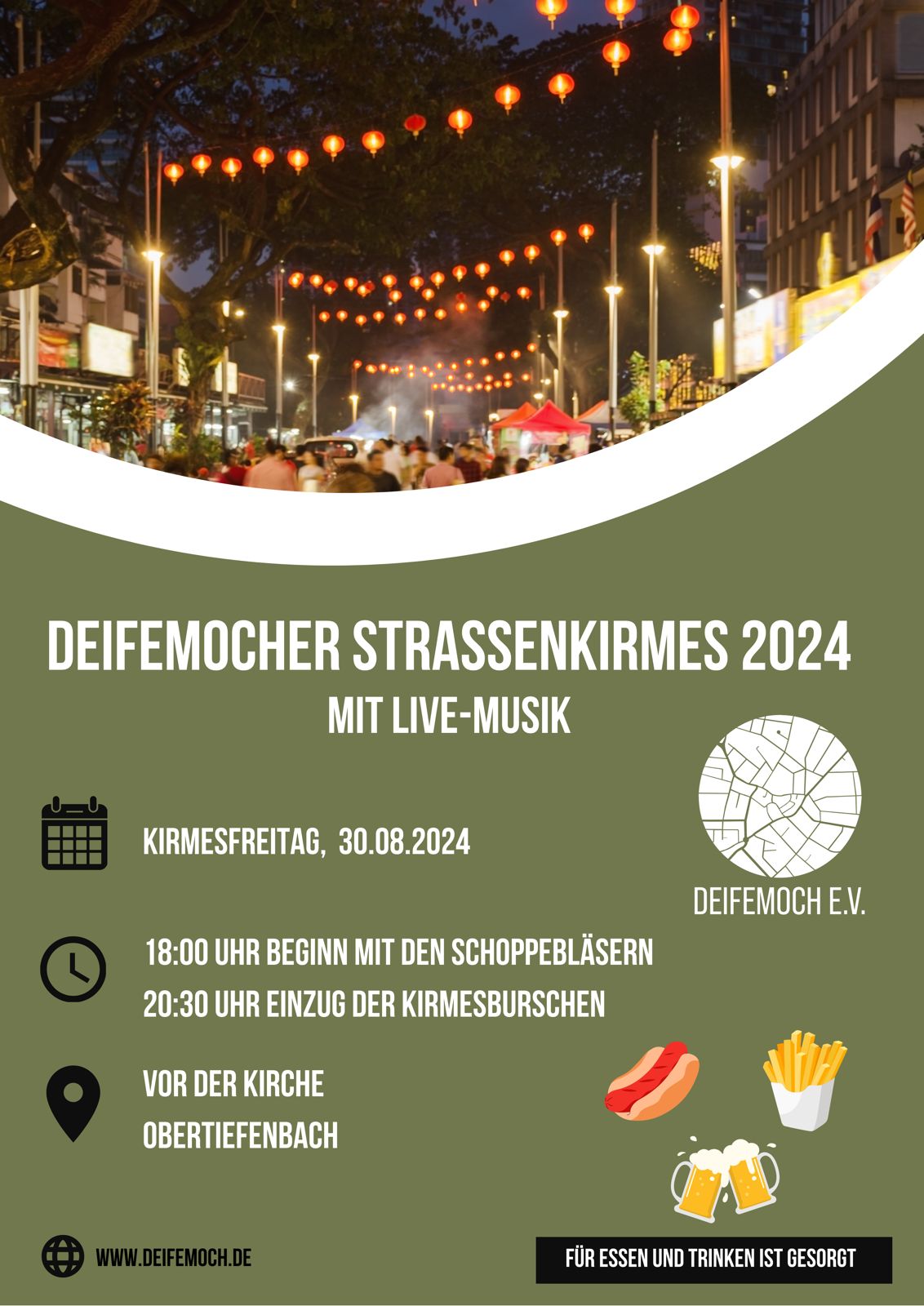Traditionell beginnt die Deifemocher Kirmes am Freitagabend mit dem beliebten Hoffest im Gasthaus Eintracht. Doch in diesem Jahr sollte alles ein wenig anders verlaufen. Aufgrund gesundheitlicher Gründe konnte das Gasthaus das Hoffest nicht wie gewohnt ausrichten. Kurzfristig sprang der Deifemoch e.V. ein und stellte innerhalb weniger Wochen eine neue Veranstaltung auf die Beine: die erste Deifemocher Straßen-Kirmes rund um den Gottfriedbrunnen.